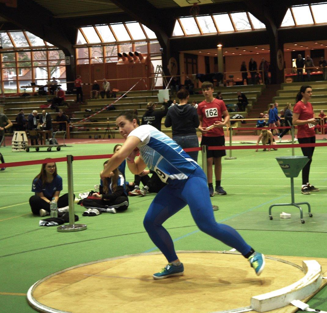 Ganz schnelle Beine bereits im 1. Zeitlauf hatte im 60-Meter-Sprint die zur absoluten Deutschen Spitzenklasse im Siebenkampf zählende Vanessa Grimm (Königsteiner LV) , wo für sie 7,85 Sekunden gestoppt wurden. Gleich am Morgen um 10 Uhr hatte sich die ich 27-jährige Olympiateilnehmern über 60-Meter-Hürden hellwach gezeigt, als sie über die 84 Zentmeter hohen Hürden sprintete und nach 8,65 Sekunden durch die Lichtschranke flog. Die 48-jährige Bundeswehrärztin und ehemalige Sprinterin des TSV Kirchhain Jennifer Schmelter, jetzt Gartemann, setzt ihre eindrucksvolle Kariere jetzt für die LG Westerwald fort. In Stadtallendorf siegte sie über 60 Meter flach in 8,12 Sekunden. Am frühen Morgen hatte sie schon über 60-Meter-Hürden in 8,65 Sekunden gewonnen. Außerdem belegte sie Platz zwei im Weitsprung mit 5,38 Metern. Marie Jung (Eintracht Frankfurt) überfloppte tolle 1,73 Meter während Carolin Klupsch (SSC Vollmar) bei 5,61 Metern in der Weitsprunggrube landete. Nach langer Wettkampfpause startet die mehrfache Hessenmeisterin aus Kirchhain Patricia Römer (ESV Jahn Treysa) mit der 4kg-Kugel, die sie auf ansprechende 13,37 Meter stieß.