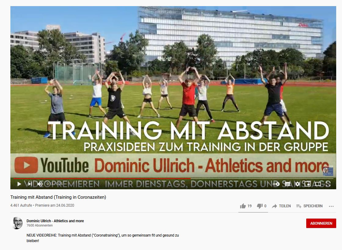 „Die Praxisvideos "Training mit Abstand" sind als Ideengeber und Orientierung für andere Vereine und Trainingsgruppen gedacht, um gemeinsam fit zu bleiben und zu zeigen, dass vieles möglich ist.“ Die Serie läuft bis heute und umfasst mittlerweile 50 Folgen. Vom „Sprung- und Sprinttraining im Sand“, über das „Weihnachtsspringen“ bis zum „Kreativen Einsatz von Matten“ erstreckt sich die Themenvielfalt. Die Anregungen erscheinen drei Mal in der Woche und werden regelmäßig tausendfach angewählt. „Der Zuspruch ist enorm und spiegelt sich in relativ hohen Zugriffszahlen sowie erhöhten Abonnentenzahlen wider.“ Wenn das Interesse weiter so anhält, rechnet Ullrich im Herbst mit einer Abonnentenzahl von 10.000 für seinen Stammkanal „Athletics and more“.